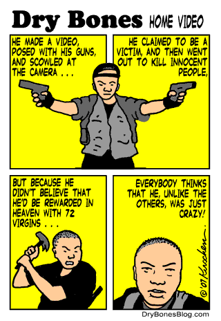Ich bin ein großer Fan der Cartoons von Yaakov Kirschen, die er täglich in seinem Dry Bones Blog veröffentlicht. Vor ein paar Tagen hat er sich auch dem Amok-Lauf in den USA gewidmet - und dabei auf die Parallelen und den unterschiedlichen Umgang mit Amokläufern in der Öffentlichkeit hingewiesen: