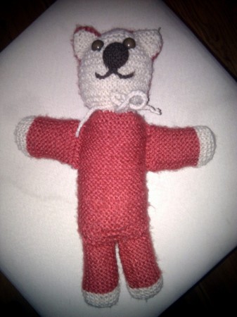 In der 2. Klasse hatten wir Stricken - und, nun ja, meine Fähigkeiten waren nicht sehr viel höher als heute, wo sie etwa bei Null liegen. Aber Mama hat immer wenn ich eine Reihe gestrickt habe, ein paar weitere hinzugefügt. Wie aus den Reihen dann ein Körper Kontur angenommen hat, war meiner Erinnerung zufolge auch nicht meine Sache.