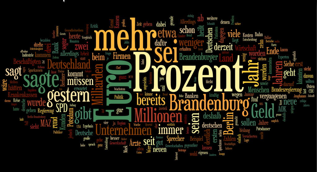 Die am häufigsten benutzten Worten mit Ausnahme von Standard-Wörtern der deutschen Sprache wie "und", "auf", "im" etc. pp. werden dabei in einer Grafik dargestellt. Je größer das Wort, desto häufiger ist es im Vergleich zu den anderen benutzt worden. Und so sieht die Wortwolke meiner MAZ-Artikel von Sommer 2001 bis heute aus: