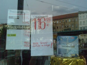 Kann man so sagen - muss man aber nicht unbedingt glauben, wenn man zum Beispiel am Schaufenster dieser Apotheke in der Kastanienallee in Berlin vorbei geht: