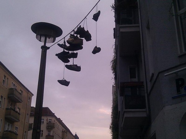 Bei uns um die Ecke sammeln sich immer mehr Schuhe auf einer zwischen Laterne und Haus gespannten Wäscheleine. Ein Kunstprojekt? Oder nur ein anderes Wort für Abfallentsorgung?