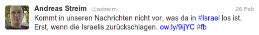und dabei auf diesen Blogeintrag verlinkt, der über die unruhige Lage in Israel, Drohungen der Hamas, Raketenangriffe auf israelische Städte etc. berichtete - alles Dinge, von denen wir sehr, sehr wenig bis nichts erfahren haben.