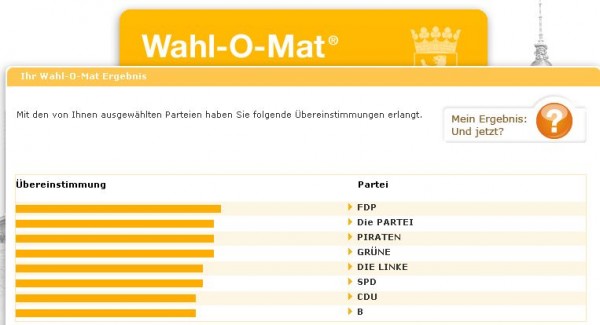 Ich habe mir mal Hilfe beim Wahl-o-mat geholt und geschaut, was der mir für die Abgeordnetenhauswahl in Berlin raten würde: