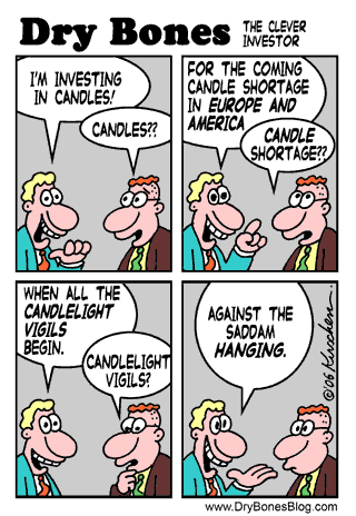 "Ich investiere in Kerzen." "Kerzen??" / "Wegen der kommenden Kerzen-Knappheit in Europa und Amerika." "Kerzen-Knappheit?" / "Wenn die ganzen Lichterketten anfangen." "Lichterketten?" / "Gegen die Hinrichtung von Saddam."