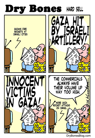 "Aus Gaza werden Raketen auf israelische Städte geschossen." (leise) / "Gaza von israelischer Artillerie getroffen." (laut) / "Unschuldige Opfer in Gaza." (laut) / "Mehr Raketenangriffe aus Gaza auf Israel." (leise) - Der Zuschauer: "Die Werbesendungen drehen ihre Lautstärke immer viel zu laut auf."